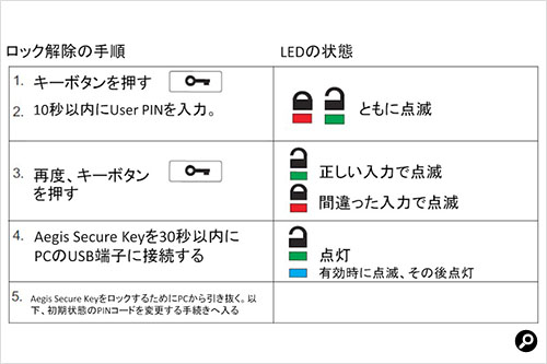 最初にAegis Secure Keyの初期状態のロックを解除する(詳細は図2)。下部にある鍵型のキーボタンを押し、所定の操作を繰り返しながら一旦ロックを外してPCに接続。接続確認ができたら再び外し、改めて任意の7~15ケタのPINコードを設定する。