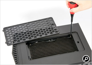 上面のカバーは簡単に外せて、ケース上部にファンやラジエーターを簡単に取り付けられる。 |