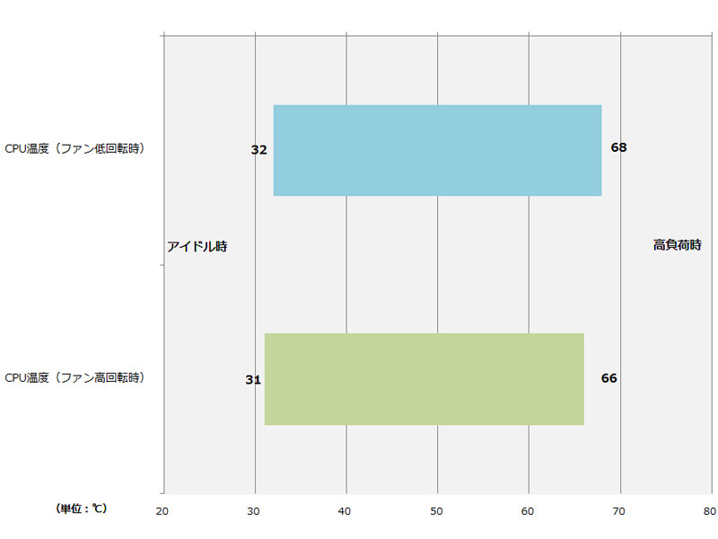 CPU温度の計測結果。室温は26℃。アイドル時は起動してから約5分、負荷時は「OCCT 4.3.2」の「CPU:Linpack」を実行後約5分後の値。負荷時に温度が68℃までしか上がらないのは、内部に冷たい外気が大量に流れ続けている証拠だ。