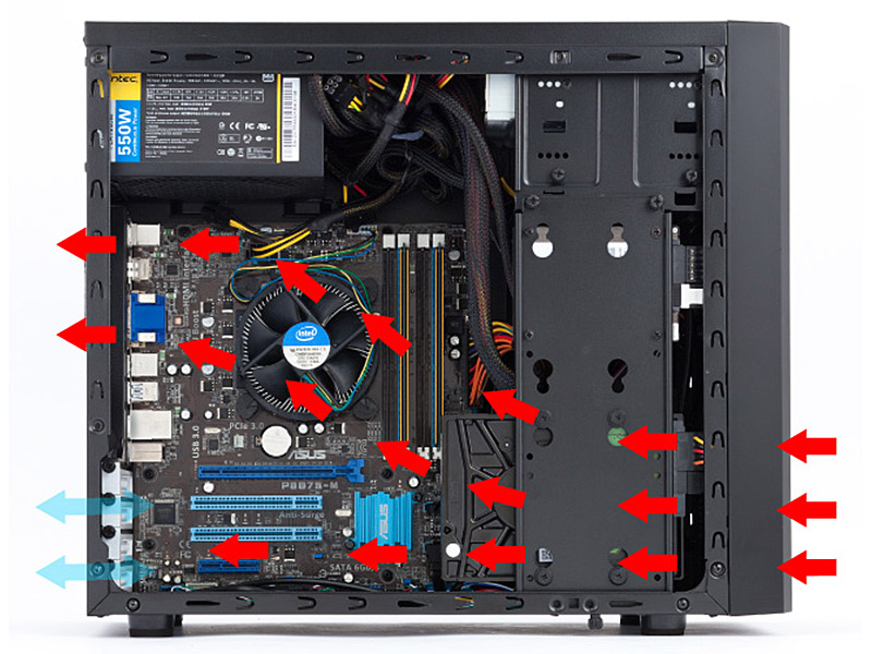 エアフローを図示した。赤い矢印は、標準搭載ファンによる空気の流れ。前面から吸気して上面と背面で排出する。