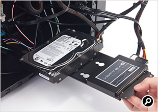 2.5/3.5インチベイはトレーによる着脱式を採用した。ドライブをトレーにねじ留めする必要はあるものの、一度付ければ交換や位置の変更が簡単だ。