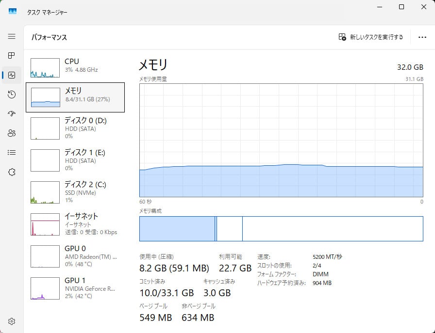 メモリの使用料はWindowsのタスクマネージャーで確認できます。画像のように、Windows 11を起動しただけでの状態で8.2GBが使用中でした。Windows 11はメモリの空き容量に余裕があると積極的に活用する仕様のため、搭載メモリが8GBなら起動直後の使用量はもっと少なくなります。とは言え、8GBではあまり余裕がないということも分かるでしょう。