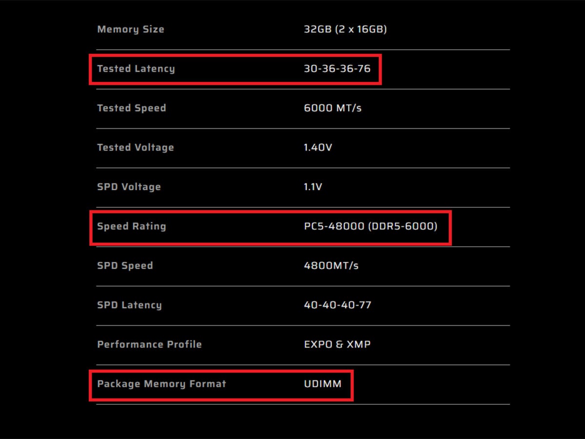 CORSAIRのWebサイトのスペック表記です。写真がなくとも、デスクトップ用のDDR5メモリで、6000MHz、レイテンシーが30-36-36-76ということが分かります。「UDIMM」は後述の「アンバッファードDIMM」を表します。また、この製品はオーバークロックメモリのため、搭載するDRAMの標準仕様が「SPD Speed」と「SPD Latency」として記載されています。