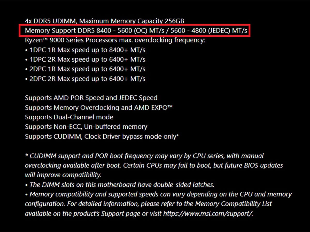 メモリそのものが高い速度に対応していても、マザーボードが対応していないと速度を生かせません。マザーボードの対応とは、UEFI(BIOS)にその動作クロックの設定項目があることを指します。例えば、マザーボードがDDR5-4800までの対応なら、DDR5-5600のメモリを搭載してもDDR5-4800として動作します。マザーボードが対応していない速度のメモリを使うとシステムが全く起動しないこともあるため、対応する範囲で製品を選ぶのが安全です。