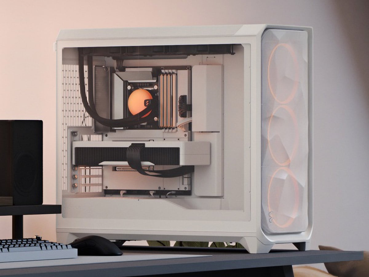 スリム型の例。タワー型と比べて小型ですが、使用可能なパーツに制約ができます。写真の「Ridge PCIe 4.0 White」(Fractal Design)はMini-ITXマザーボードに対応し、縦置き時の幅は110mmと薄くなっています。ライザーケーブルを使うことで通常サイズのグラフィックボードを内蔵できる構造を採用しています。