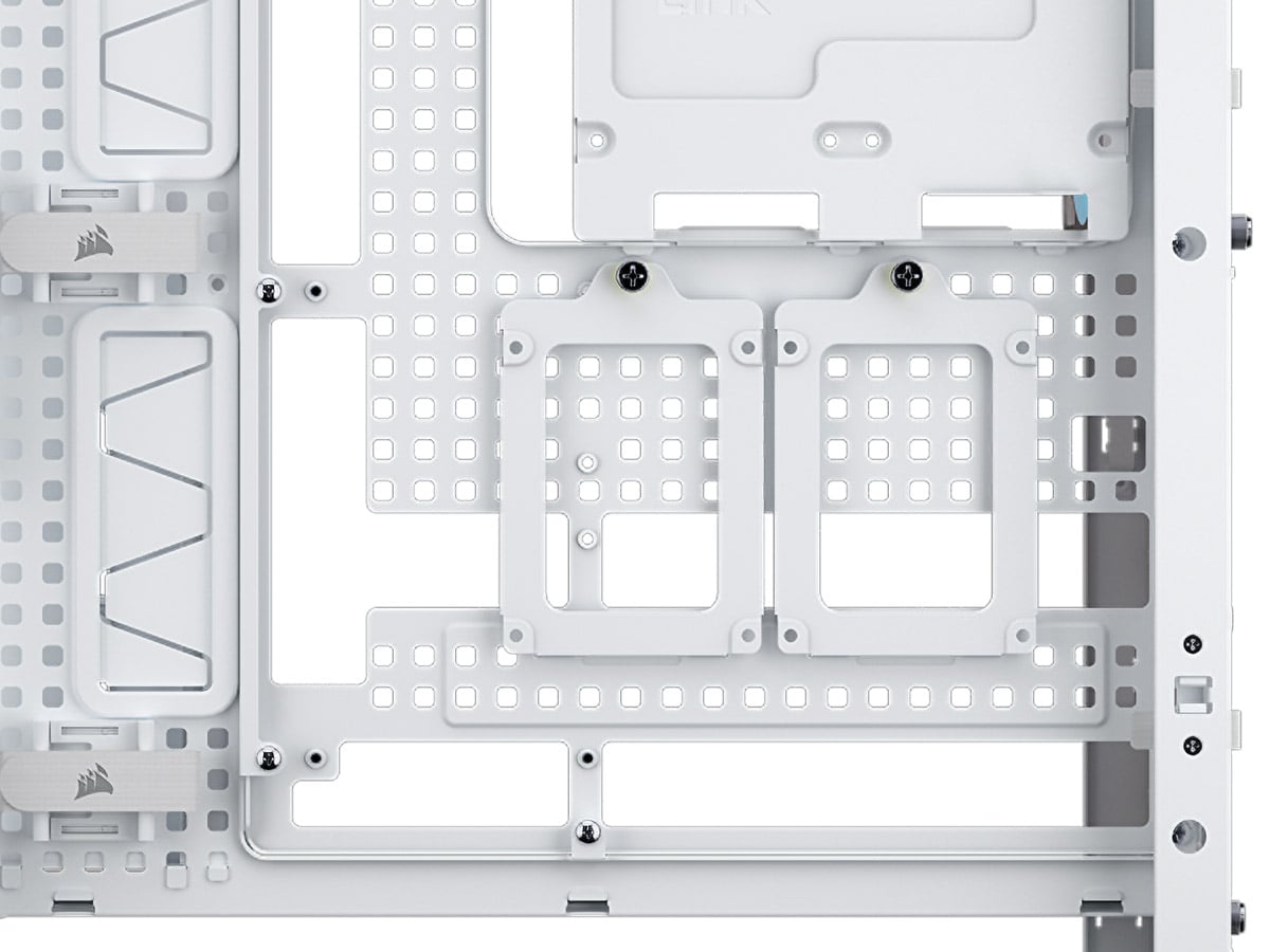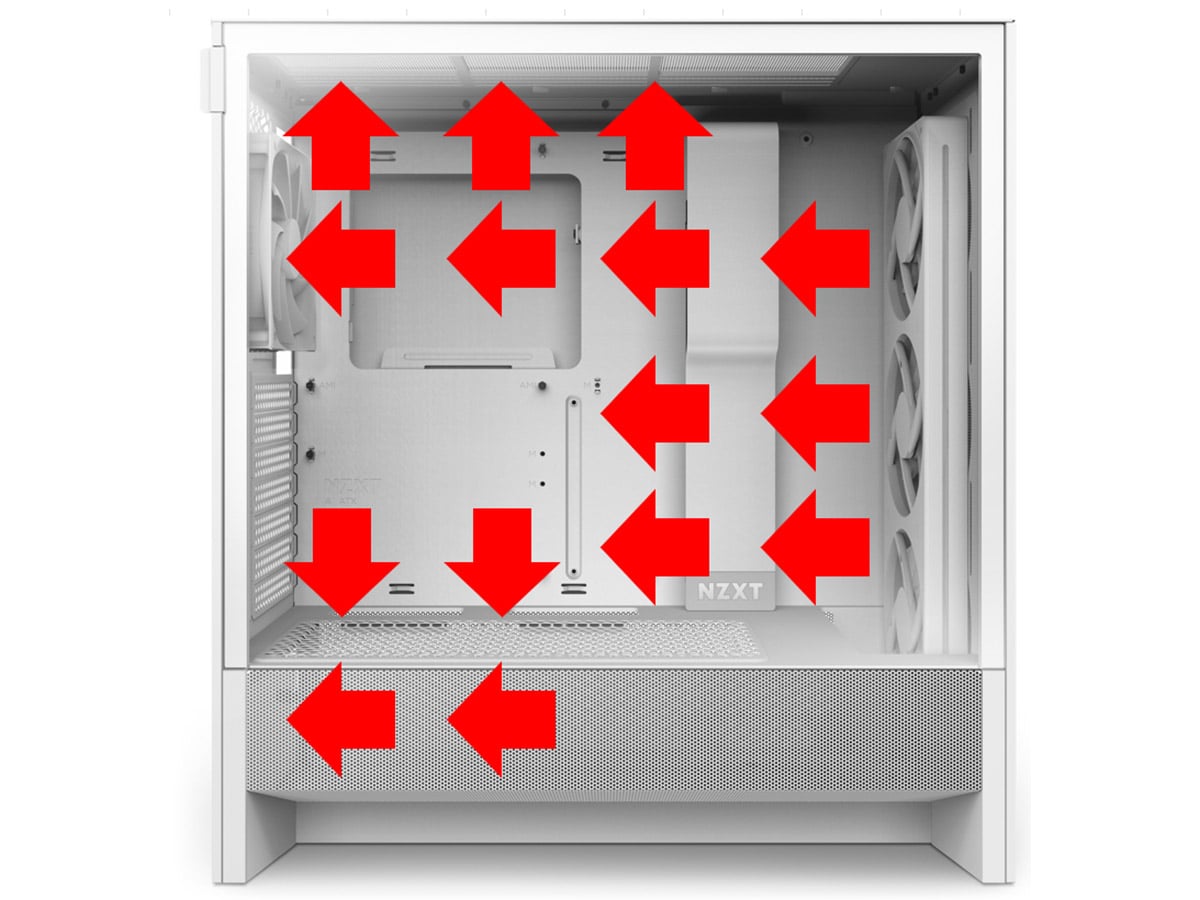 エアフローは、タワー型のPCケースでは前面ファンで外気を取り込んで背面から排出する形が一般的です。気になるところにファンを追加できるよう、サイドパネルや電源ユニット部のシュラウドなど、ファンを搭載できる場所を確認しておくとよいでしょう。