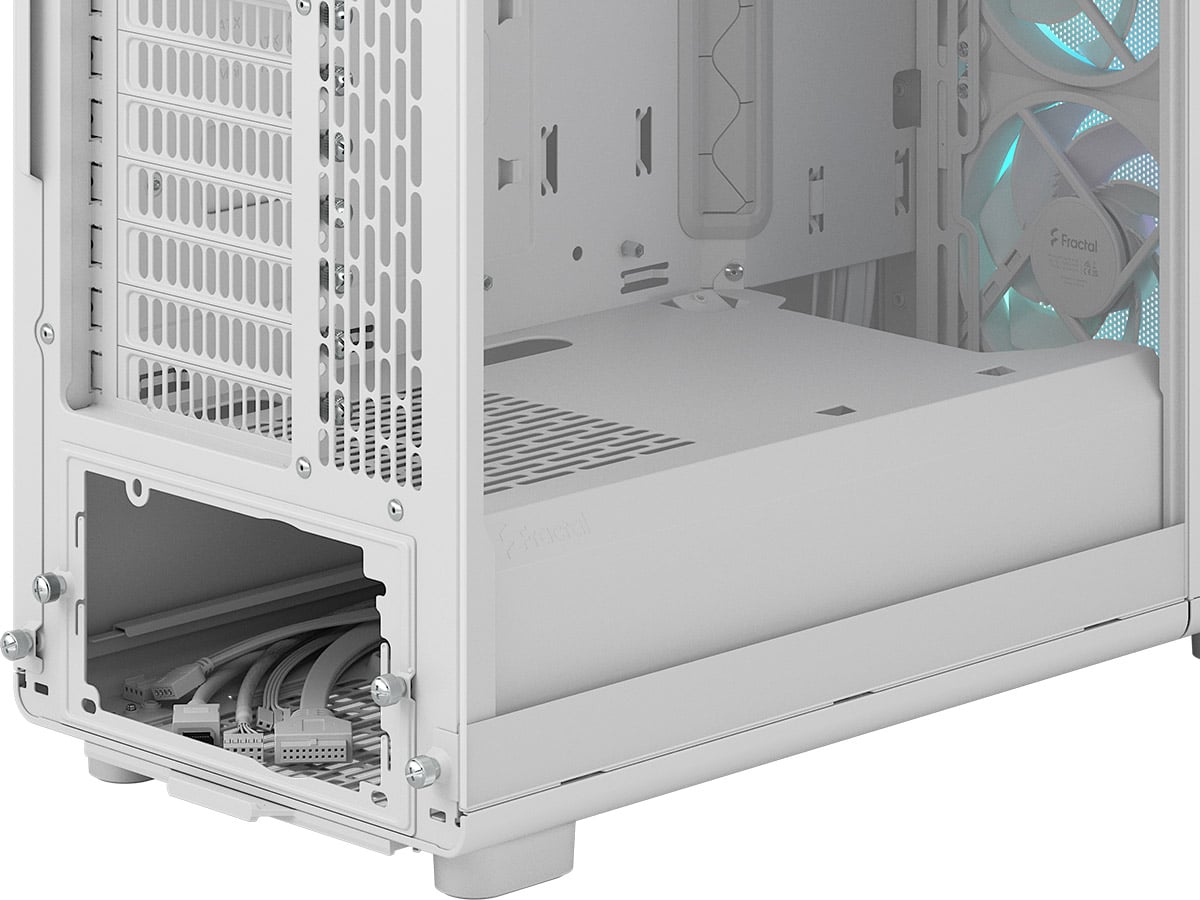 電源ユニットからは多数のケーブルが伸びており、余ったケーブルをそのままにしておくと見た目が良くありません。そこで、PCケース下部を覆って電源ユニット周辺を隠してしまう「シュラウド」が流行しています。ドライブベイをシュラウドの中に入れているモデルもあります。