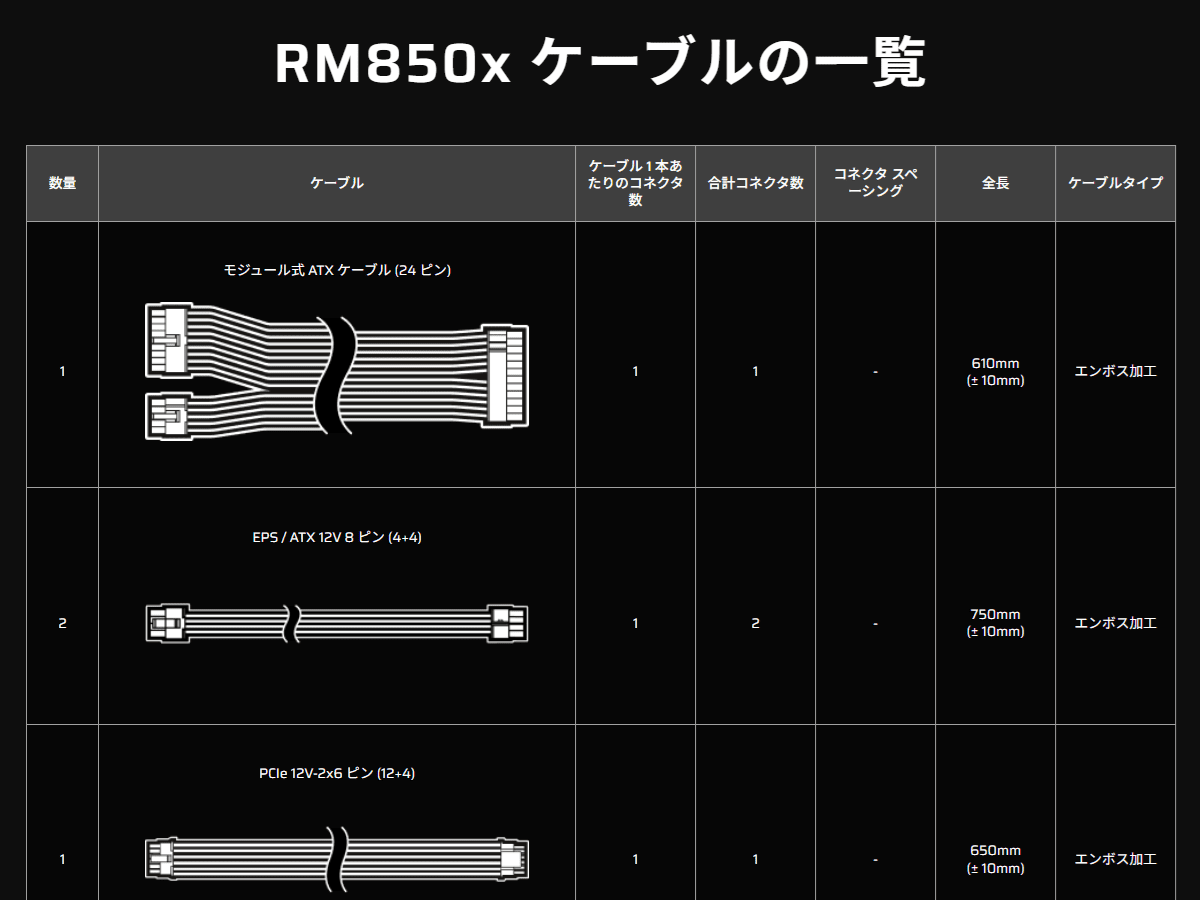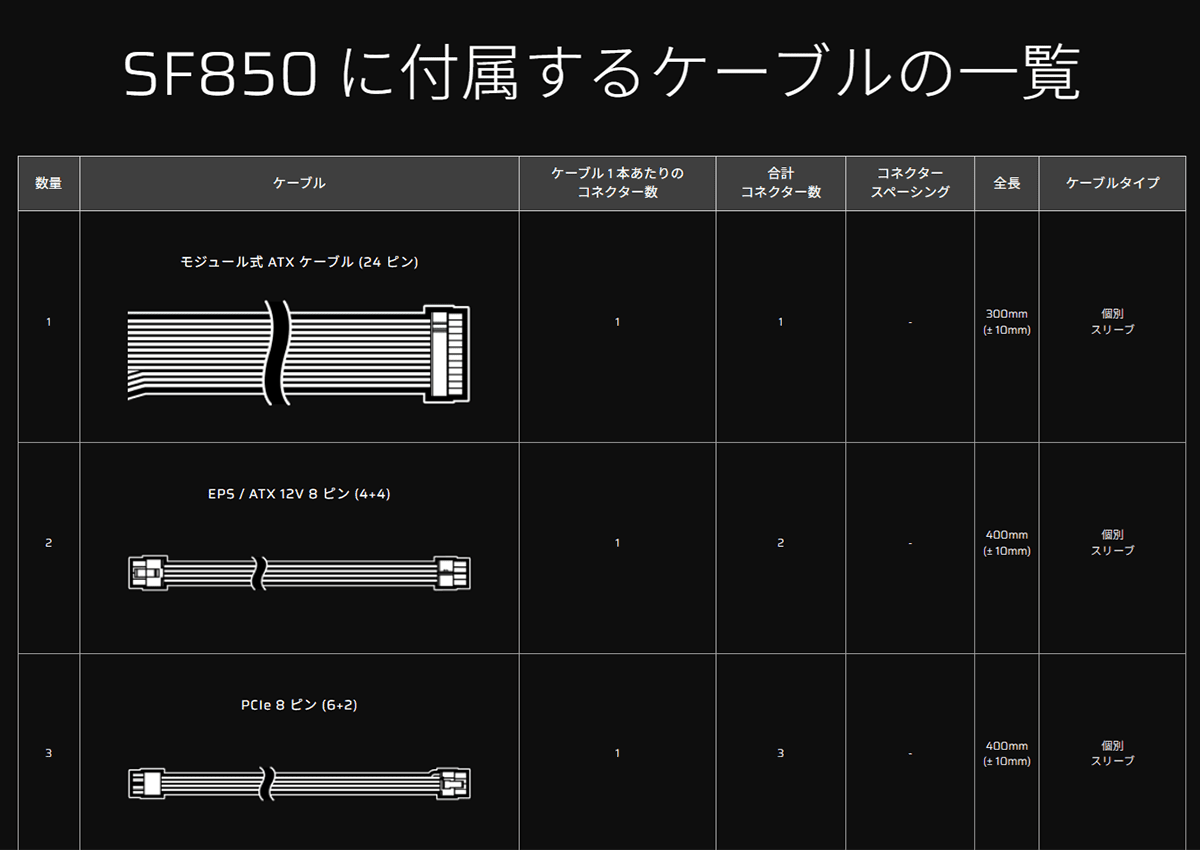 極端な例だが、ATX電源とSFX電源では付属ケーブルの長さが全く違う。CORSAIRの「RM850x」と「SF850」では、容量は同じ850Wだがメイン24ピンケーブルは前者の610mmに対して後者は300mmと半分しかない。