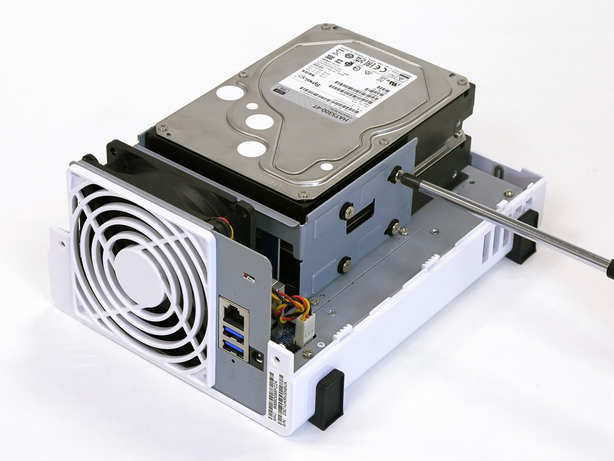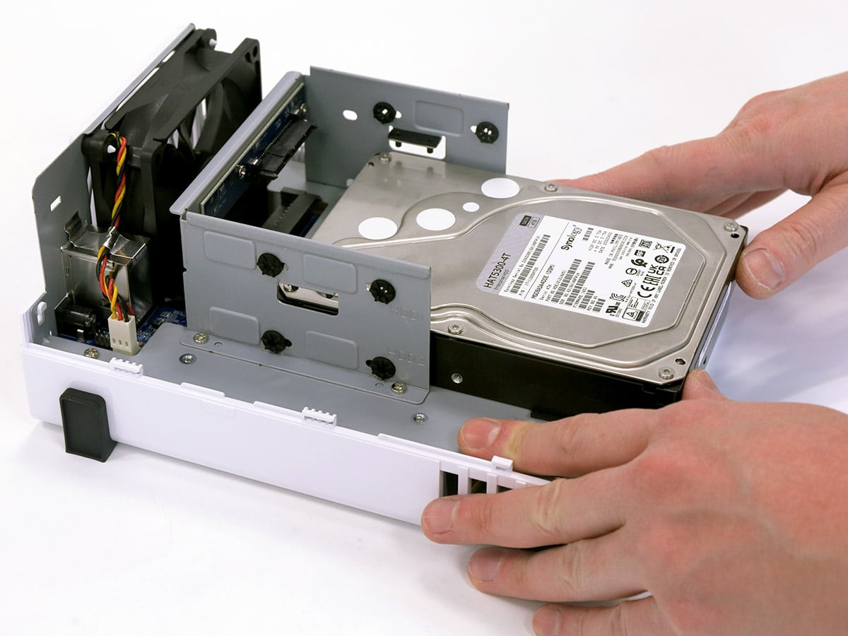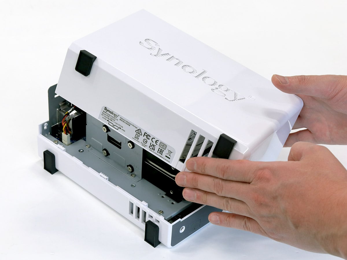 SynologyのNASは基本的に組み立てキットなので、自分でHDDを組み込む必要がある。ただ、組み立てはとても簡単にできるように工夫されている。写真で手順を紹介しよう。この手順はDS223jのもので、モデルによって手順が異なる場合がある。例えば、「PLUS」シリーズは着脱可能なトレイを使って取り付ける。筐体を開ける必要がなく、簡単にドライブの取り付け/交換ができる。