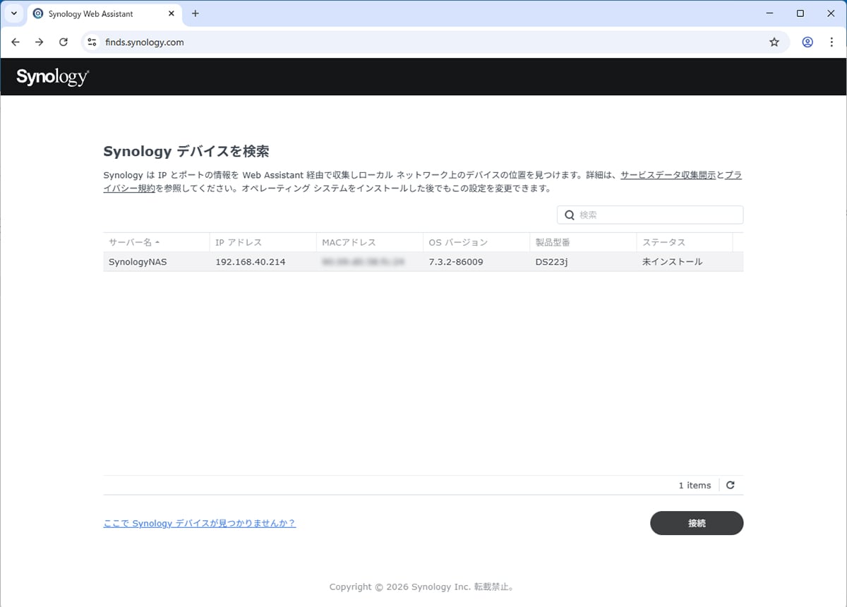 Webブラウザーのアドレスバーに「finds.synology.com」と入力すると、LAN内にあるSynology製のNASが検出される。専用ユーティリティの「Synology Assistant」をダウンロードして利用してもよい。