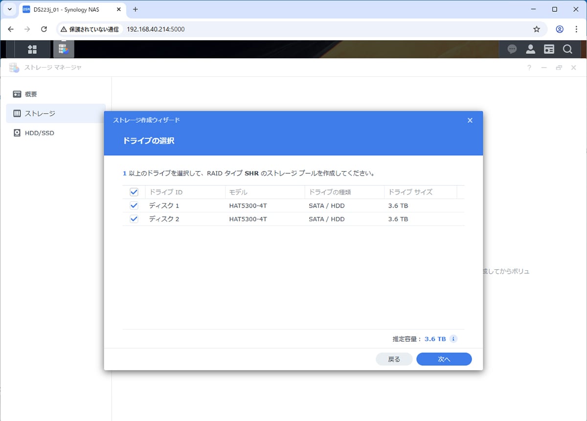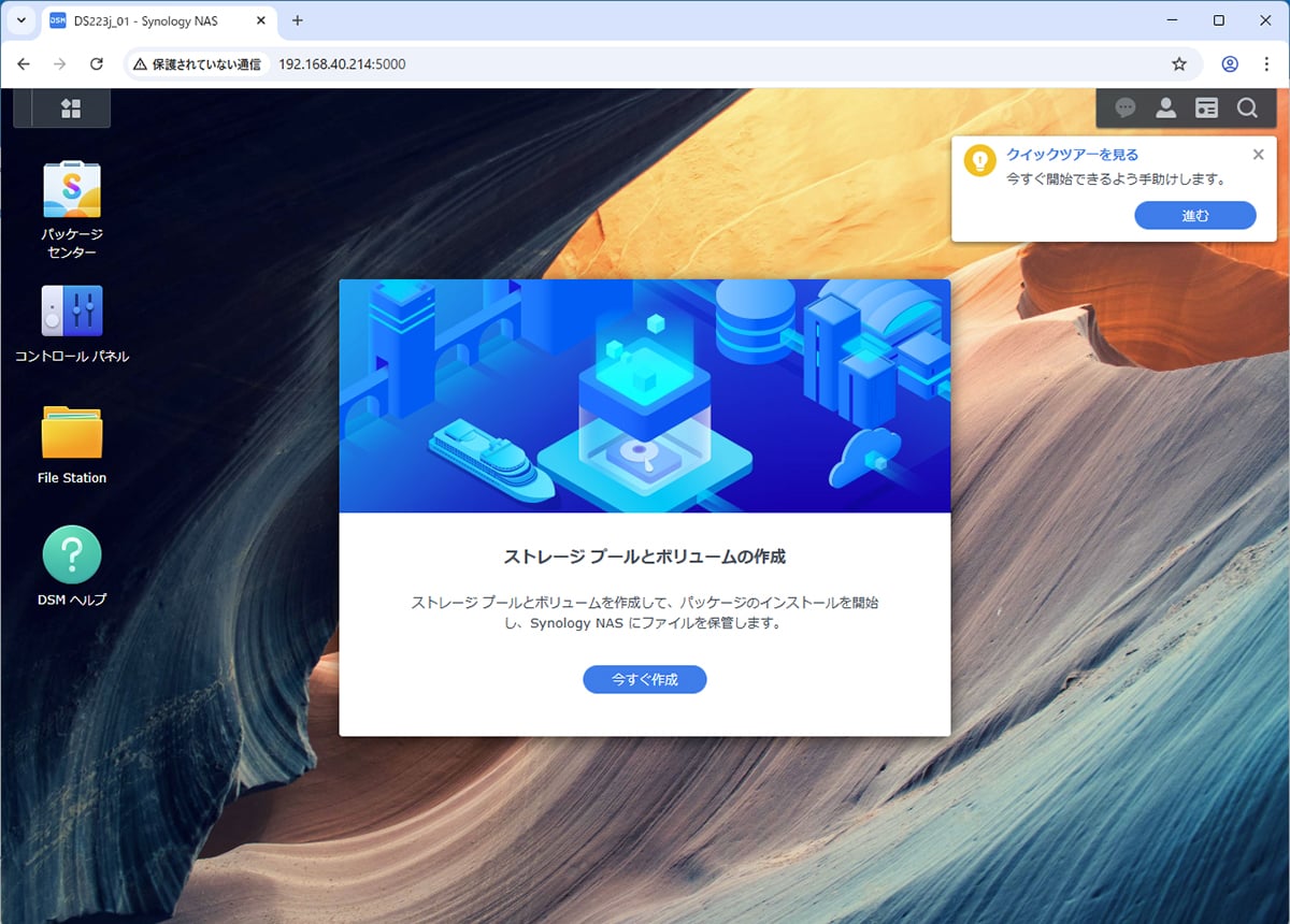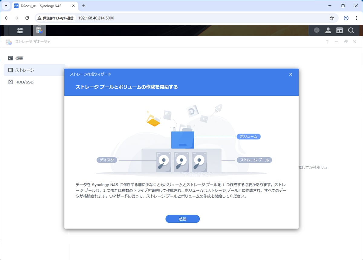 この時点ではまだDSMがインストールされただけで、ストレージとして利用できない。内蔵したドライブをどのように管理するかの設定を行う必要がある。