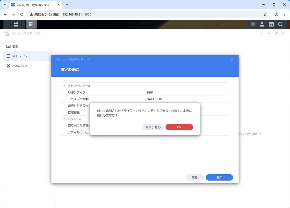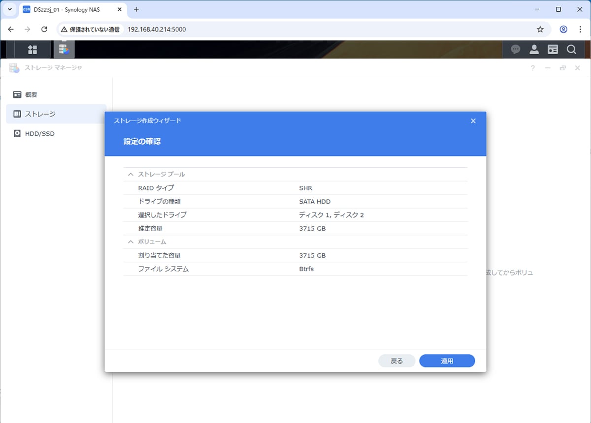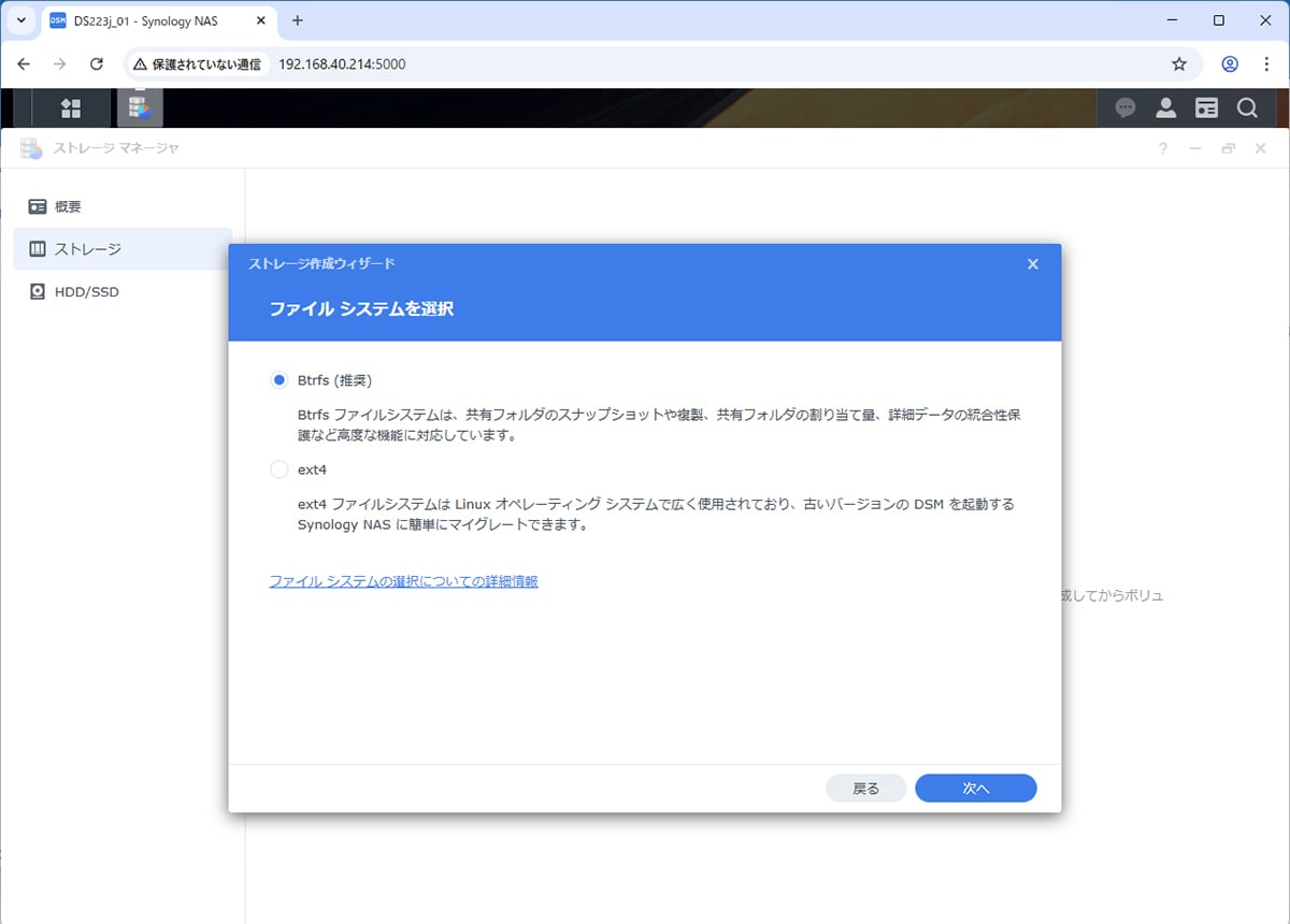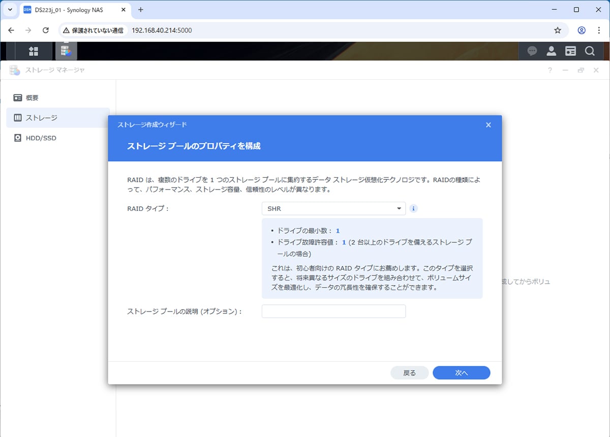 この時点ではまだDSMがインストールされただけで、ストレージとして利用できない。内蔵したドライブをどのように管理するかの設定を行う必要がある。