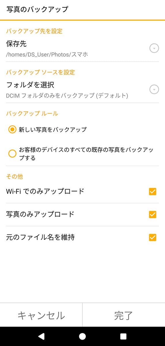 バックアップ元のフォルダーは、「DCIMフォルダーのみ」を選択するとカメラで撮影した写真のみが対象になり、スクリーンショットはバックアップされない。一通りバックアップするのであれば、「すべてのフォルダーをバックアップ」を選ぼう。また、重要な設定が「Wi-Fiでのみアップロード」。高解像度な写真は1枚で容量が数MBあるため、携帯電話の回線でアップロードすると大容量の通信が発生してしまう。忘れずにチェックが入っていることを確認しよう。