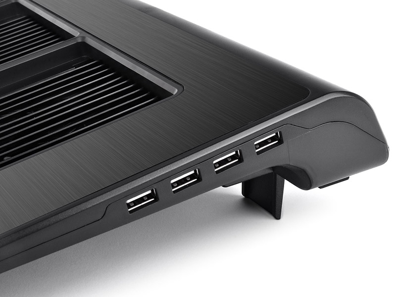 見た目はオーソドックスなノートPCクーラー「Allways Control」。ファンを2基搭載し、それぞれ独立して風向きの調整が可能。ファンの回転数は連動し、1,300rpm~2,100rpmで切り替えられる。給電は左側面のUSBポートから行い、右側面にはUSB2.0ハブを4ポート装備する。