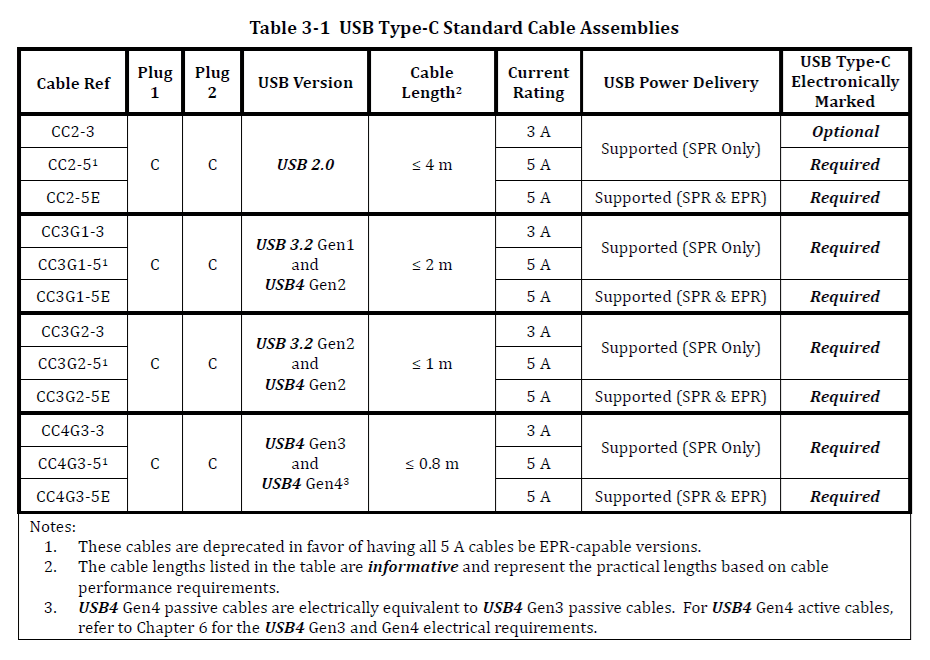USB-IFの公開しているUSB Type-Cの仕様書からの引用。「Cable Length」が目安のケーブル長だ。USB 3.2 Gen 2は1m以下となっている。ただし注釈で「informative(参考)」となっており、厳密に決まっているわけではない。また、USB Type-C以外のケーブルには長さを直接定めた規定はない。