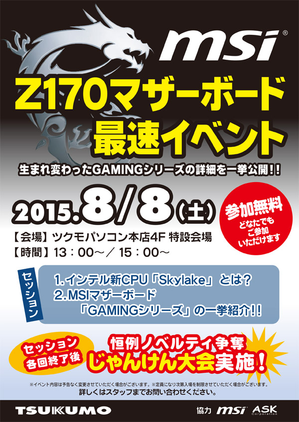 株式会社アスク(本社:東京都千代田区)は、ツクモパソコン本店において、「MSI Z170マザーボード最速イベント」を8月8日(土)に開催いたします。