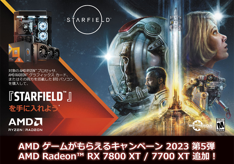 弊社取り扱いメーカーであるAMD社は、2023年7月11日(火)~9月30日(土)の期間、対象製品となるAMD Ryzenプロセッサ及びAMD Radeonグラフィックボード、または対象のプロセッサとグラフィックボードの両方を搭載するBTOパソコンをご購入いただいた方を対象に、アクションRPGゲーム「Starfield™」をプレゼントするキャンペーンを実施しております。