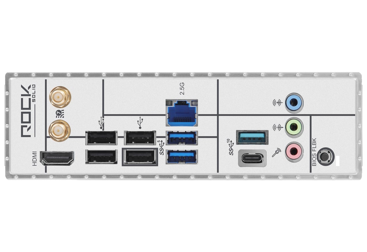 | インターフェース | USB 10Gbps×2(Type-C×1、Type-A×1) USB 5Gbps×7(Type-A×2、Type-C 内部コネクタ×1、ヘッダピン×4) USB 2.0×8(Type-A×4、ヘッダピン×4) オーディオジャック×3(Realtek ALC897) 2.5ギガビットイーサネット×1(Realtek Dragon RTL8125BG) Wi-Fiアンテナ用ポート×2 |