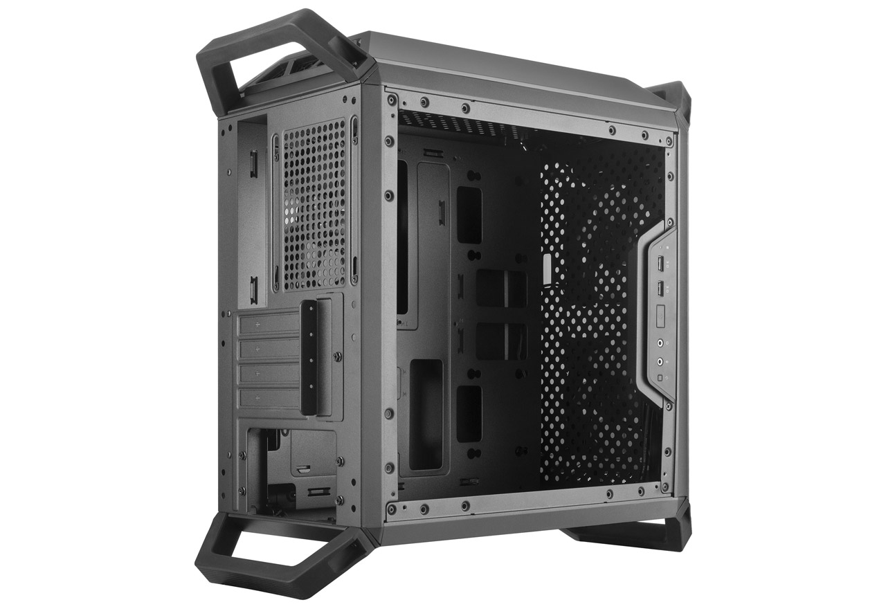 ケースの縦置きはもちろん、ケース側面に横置き用のゴム足を装備しており、縦置き・横置きに両対応しています。また、ケースの4箇所に取り外し可能なハンドルを装備。PCの持ち運びに便利です。