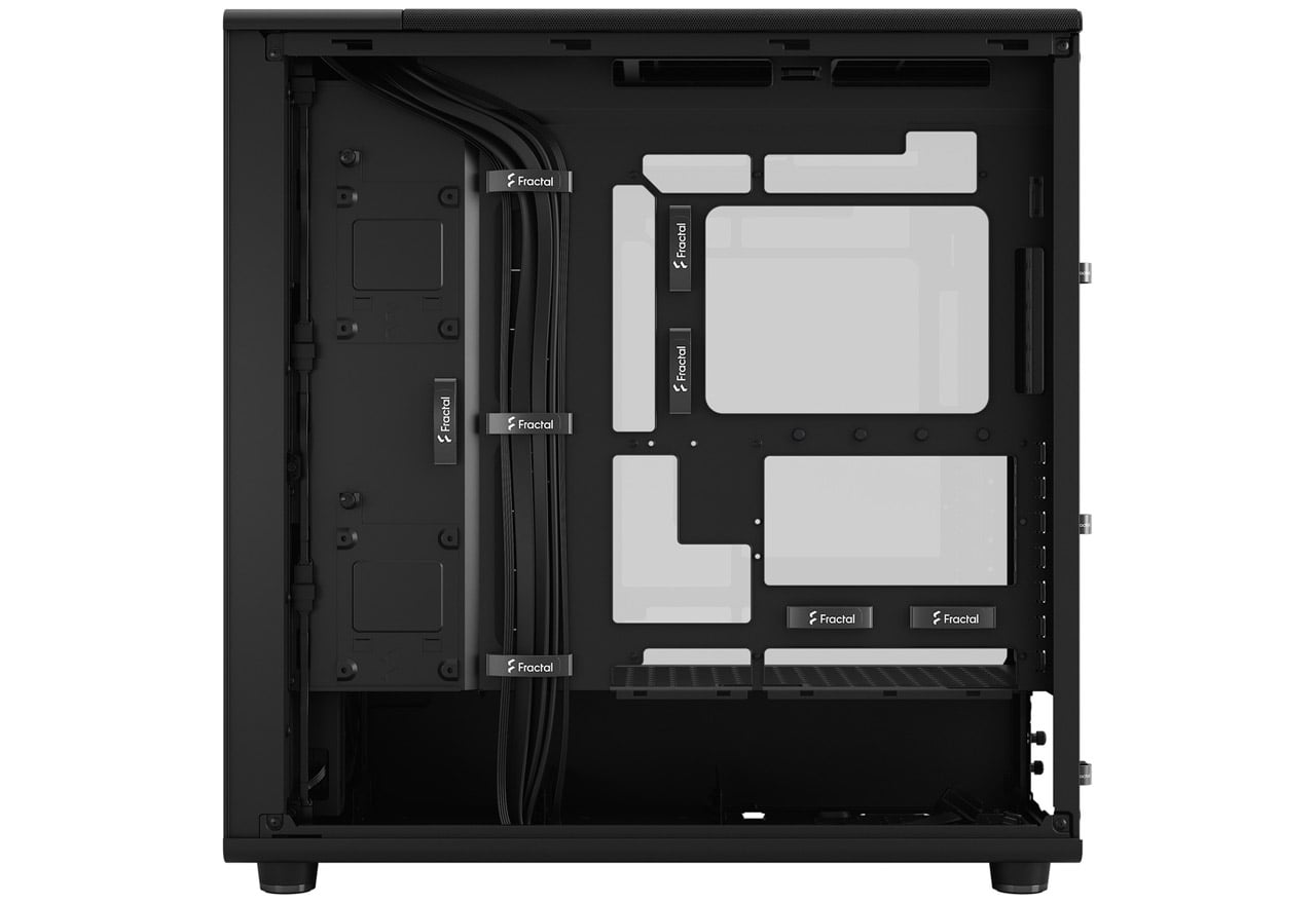 木材を使ったフルブラックデザイン。3基の液晶ポリマー製ブレードファンを搭載し、高いエアフローを実現するフルタワー型PCケース