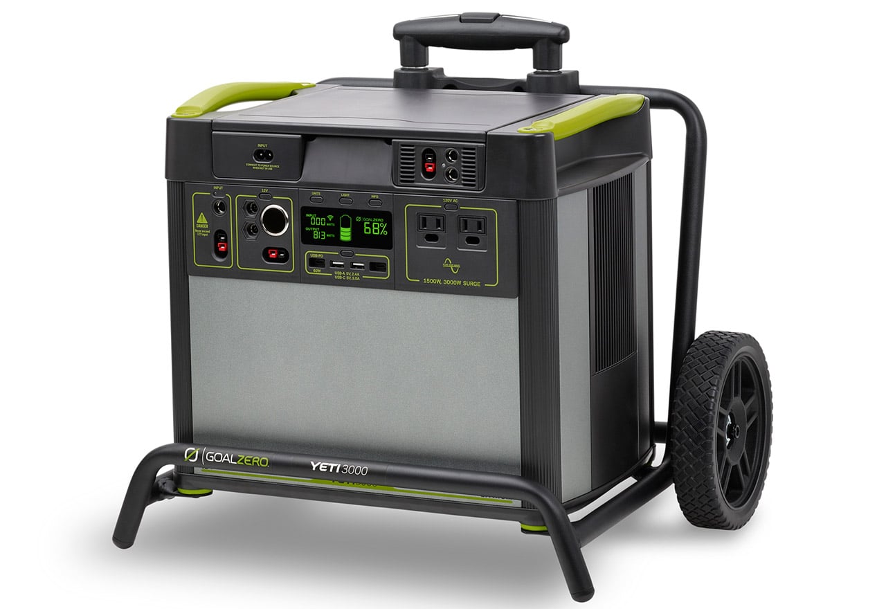 Yeti Lithium 3000 WiFi (120V) Power Stationは、電池容量3,075Whのリチウムイオン電池を搭載したポータブル電源です。多くの電力を必要とする際に活躍する大容量モデルで、ノートPCやテレビをはじめ、様々な電気製品の同時利用も可能。持ち運びに便利なキャリーカートを付属しており、川や山といったアウトドアでの活用に加え、倉庫や納屋、災害時の避難所などの電力が届かない場所においても、幅広く活用することができる製品です。