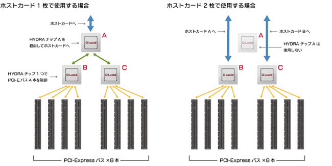 ホストシステムにPCI-Express x16スロットが1本しかない場合、ホストカード1枚でも接続することが可能です。