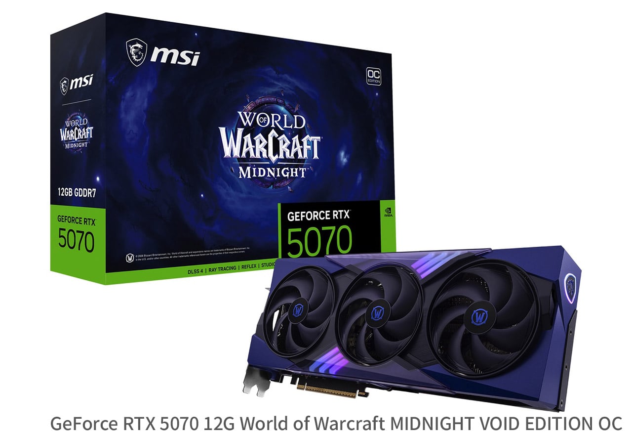 | 製品名 | MSI GeForce RTX 5070 12G World of Warcraft MIDNIGHT VOID EDITION OC | MSI GeForce RTX 5070 12G World of Warcraft MIDNIGHT LIGHT EDITION OC |