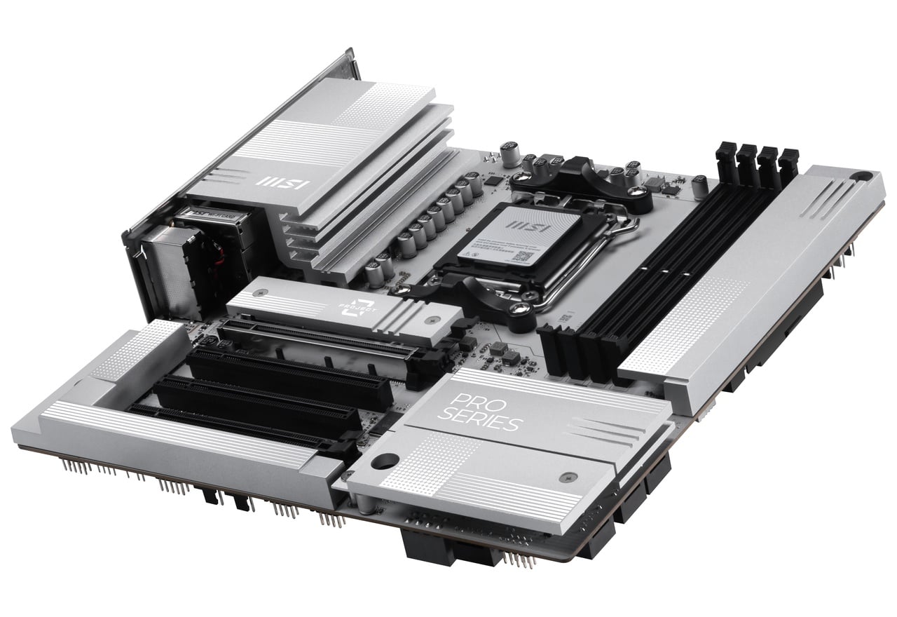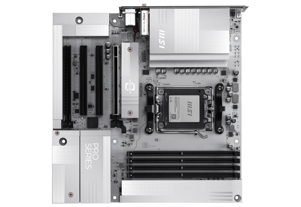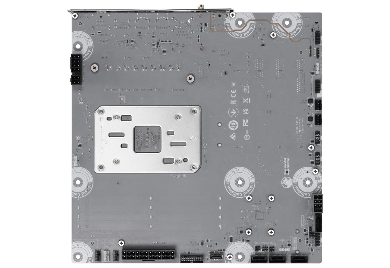 AMD B850チップセット搭載。背面コネクタ設計を採用しホワイトシルバーのヒートシンクを備えたmicroATXマザーボード