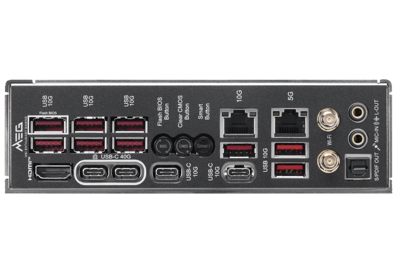 | インターフェース | USB 40Gbps×2(Type-C×2) USB 20Gbps×1(Type-C 内部コネクタ×1) USB 10Gbps×11(Type-C×2、Type-A×9) USB 5Gbps×4(ヘッダピン×4) USB 2.0×4(ヘッダピン×4) オーディオジャック×2(Realtek ALC4082+ESS9219Q) オプティカル S/PDIFポート×1 10ギガビットイーサネット×1(Marvell AQC113CS) 5ギガビットイーサネット×1(Realtek RTL8126) Wi-Fiアンテナ用ポート×2 |