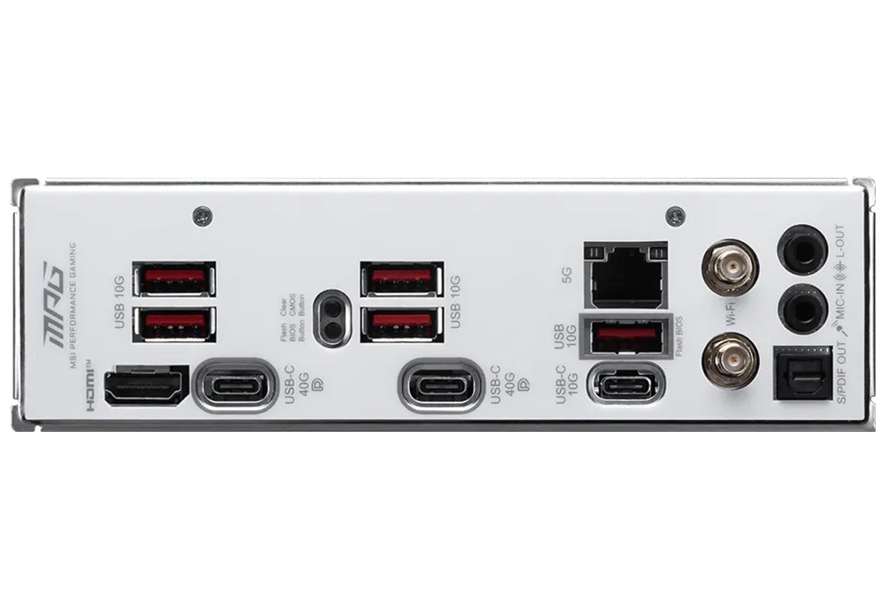 | インターフェース | USB 40Gbps×2(Type-C×2) USB 20Gbps×1(Type-C 内部コネクタ×1、5-in-1 Xpanderカード使用) USB 10Gbps×6(Type-C×1、Type-A×5) USB 5Gbps×2(ヘッダピン×2、5-in-1 Xpanderカード使用) USB 2.0×2(ヘッダピン×2) オーディオジャック×2(Realtek ALC4080) オプティカル S/PDIFポート×1 5ギガビットイーサネット×1(Realtek RTL8126) Wi-Fiアンテナ用ポート×2 |