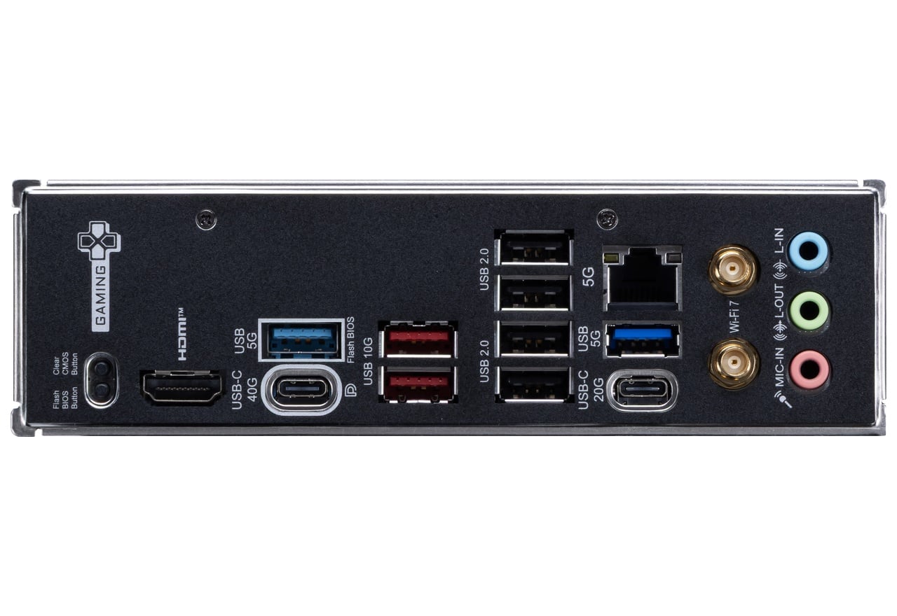 | インターフェース | USB 40Gbps×1(Type-C×1) USB 20Gbps×1(Type-C×1) USB 10Gbps×3(Type-A×2、Type-C 内部コネクタ×1) USB 5Gbps×6(Type-A×2、ヘッダピン×4) USB 2.0×10(Type-A×4、ヘッダピン×6) オーディオジャック×3(Realtek ALC897) 5ギガビットイーサネット×1(Realtek RTL8126-VB) Wi-Fiアンテナ用ポート×2 |