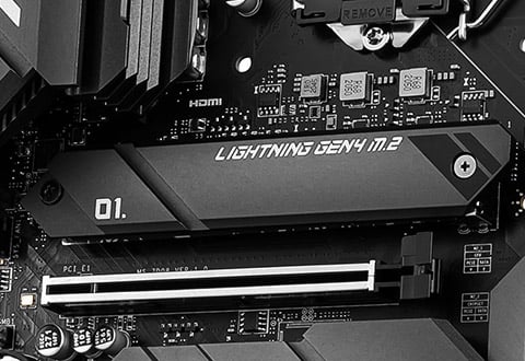 PCI Express 4.0 x4の帯域を使用することにより、最大64Gb/sの転送速度を実現することができるLightning M.2スロットを装備。M.2フォームファクターのSSDを広くサポートし、PCIeインターフェースでの動作に対応。小型でより柔軟性のあるパーツ構成が実現できます。また、M.2 SSD用の冷却機構として、「M.2 Shield Frozr」ヒートシンクを採用しています。