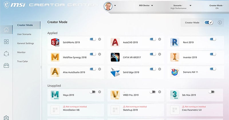 システムのモニタリングやパフォーマンスの調整、電源プランの適用などを設定できるシステム管理ソフト「Creator Center」が利用できます。クリエーターモードを有効にすれば、実行スレッドの設定、GPUやメモリ性能の最適化、処理の優先順位などをソフトごとに細かく設定できます。