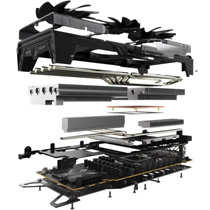 高い電源効率を誇るブラックダイヤモンド4・チョークや、ヒューズプロテクションを内蔵したPCIe電源コネクタ用回路から構成される高品質な設計を採用するほか、ダブルボールベアリングを採用するトリプルファン、8mm径ヒートパイプ3本と6mm径ヒートパイプ3本に加え、銅製ベース、VRM冷却モジュールを備えた強力な冷却ユニットを装備しています。