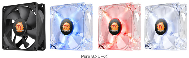 Thermaltake製キューブPCケース「Core V1」に取り付けられる8cmモデル「Pure 8」をはじめとして、12cmモデル「Pure 12」と14cmモデル「Pure 14」を同時リリース。それぞれのモデルでLED無しモデルのほか、LED付きモデルはブルー、レッド、ホワイトの3色をご用意。PCケース内部のドレスアップだけでなく、水冷キットやCPUクーラーの標準ファンとの交換用途にもご使用いただけます。