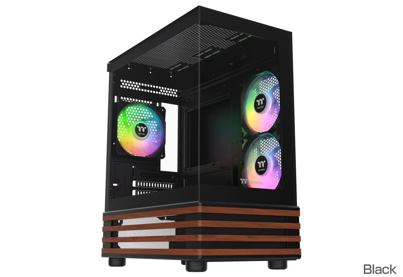 フロントと左サイドに3mm厚の強化ガラスパネルを備え、木製ラインがアクセントとなるピラーレスデザインを採用。アドレサブルRGBファンを3基搭載しており、ASUS、ASRock、GIGABYTE、MSI社製の対応マザーボードからコントロールが可能です。