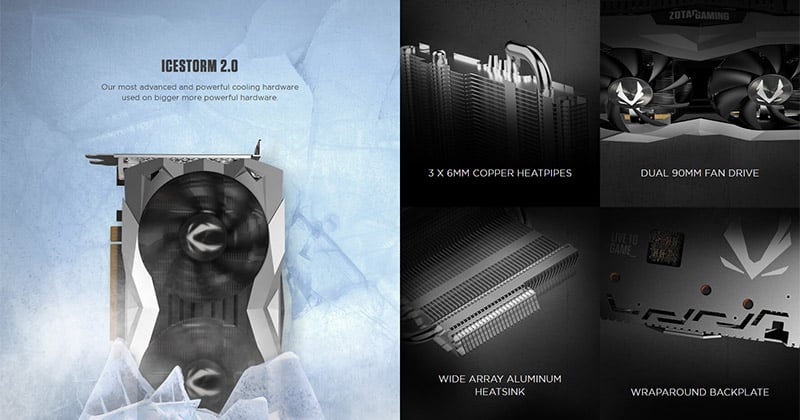 90mm径デュアルファンに加え、3本の6mmヒートパイプ、大型アルミフィンを備えるヒートシンクを組み合わせたオリジナルクーラー「IceStorm 2.0」を搭載。さらに、前面から背面までをカバーする折り返し付きバックプレートを装備し、高い耐久性を実現しています。